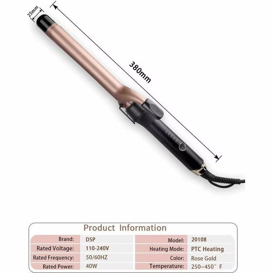 پوشش سرامیک طول سیم1.5 متر سایر توضیحات فرکننده مو با سایز 25 میلی متر قابل تنظیم در 5 سطح دمایی تا 450 درجه فارنهایت/ پوشش سرامیک و تکنولوژی PTC فر کننده مو دی اس پی DSP 20108 با میله 25 میلی متری امکان ایجاد فر های زیبا و خوش حالت را بر روی موها فراهم می کند. میله دستگاه دارای روکش سرامیکی/ تورمالین می باشد. میله ی سرامیکی/تورمالین به شکلی عالی دما را انتقال می دهد و موجب نرمی، لطافت و درخشندگی موها می گردد. دکمه روشن و خاموش به صورت جداگانه تعبیه شده اند. با فشار دکمه روشن چراغ نشان گر دما روشن می شود که نشان دهنده روشن بودن دستگاه می باشد. با استفاده از دکمه تنظیم دما می توان دمای مطلوب را انتخاب نمود. بابلیس مو دی اس پی دارای قابلیت تنظیم در 5 دمای مختلف می باشد