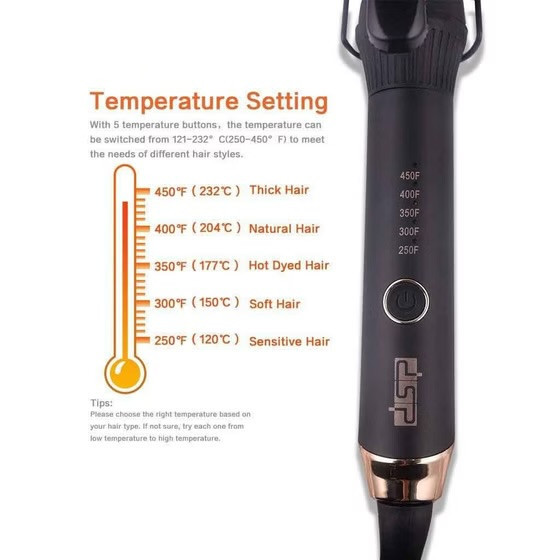 (250/300/350/400/450 درجه ی فارنهایت) که بسته به نوع مو می توان دمای مورد نظر را انتخاب نمود. طیف دمایی 250F تا 300F مناسب موهای ظریف، دکلره شده و آسیب دیده می باشد. جهت حالت دادن موهای طبیعی رنگ شده و موج دار می توان از طیف دمایی 350F تا 400F استفاده نمود. طیف دمایی 450F برای حالت دادن موهای ضخیم می باشد. پس از انتخاب دما چراغ نشانگر قرمز رنگ شروع به چشمک زدن می کند. تا دمای میله به دمای تنظیم شده برسد. در این حالت چراغ نشانگر به صورت ثابت روشن می ماند
